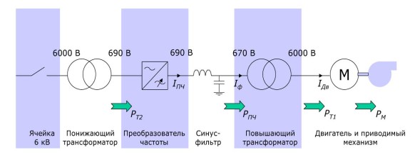 Системы управления высоковольтными электродвигателями состоят из низковольтных преобразователей частоты (0.4/0,69 кВ) и стандартных трансформаторов.
