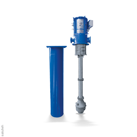 Вертикальный, одноступенчатый и многоступенчатый насос, секционный насос горшкообразной конструкции, для подпольной установки в шахте на опорной раме, радиальные рабочие колеса, лопастные колеса с косым потоком, двупоточные всасывающие колеса, фланцы по стандартам DIN или ASME, также имеется в повторно подводящей конструкции, фланцы по DIN или ANSI. Области применения: перекачивание конденсата в электростанциях и промышленных установках.